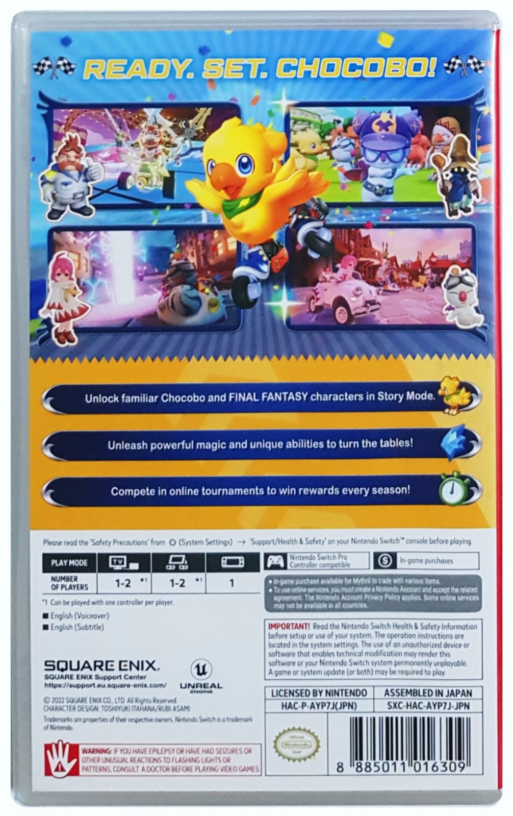 Start your engines and get set for a new racing experience, featuring a roster of dozens of your favorite Chocobo characters, complete with their own unique abilities and variants. Equip Magicites and take out the competition as you drift through various familiar courses in online and offline multiplayer modes. Compete in tournaments and become the reigning champion of GP!
