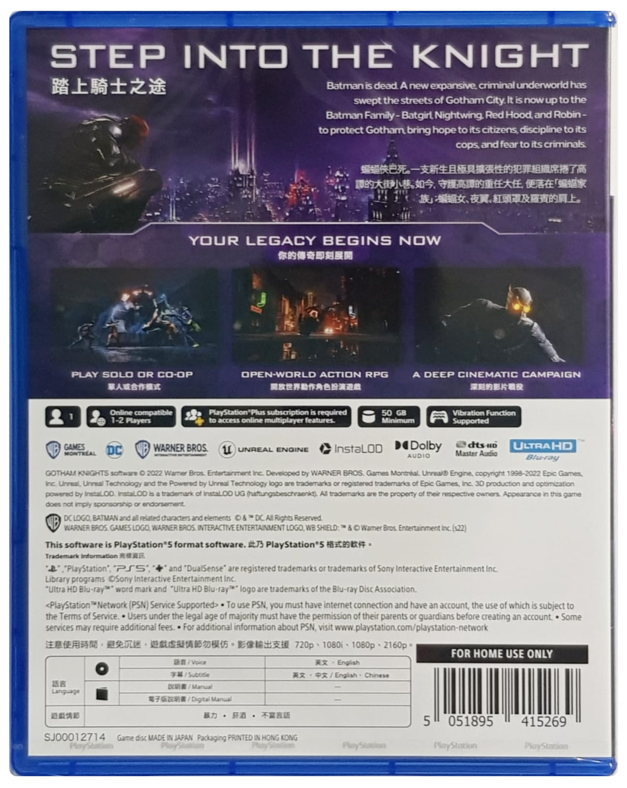 Explore and Fight Crime in an Open-World Gotham City – Patrol the dark streets of five distinct boroughs in a dynamic, interactive Gotham using a variety of traversal abilities and heroic combat moves, as well as the iconic Batcycle. From street-level crimefighting to face-offs with iconic DC Super-Villains, save the city from descent into chaos.
