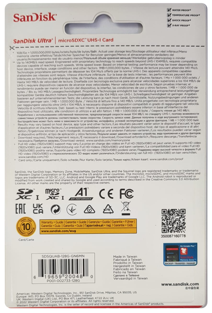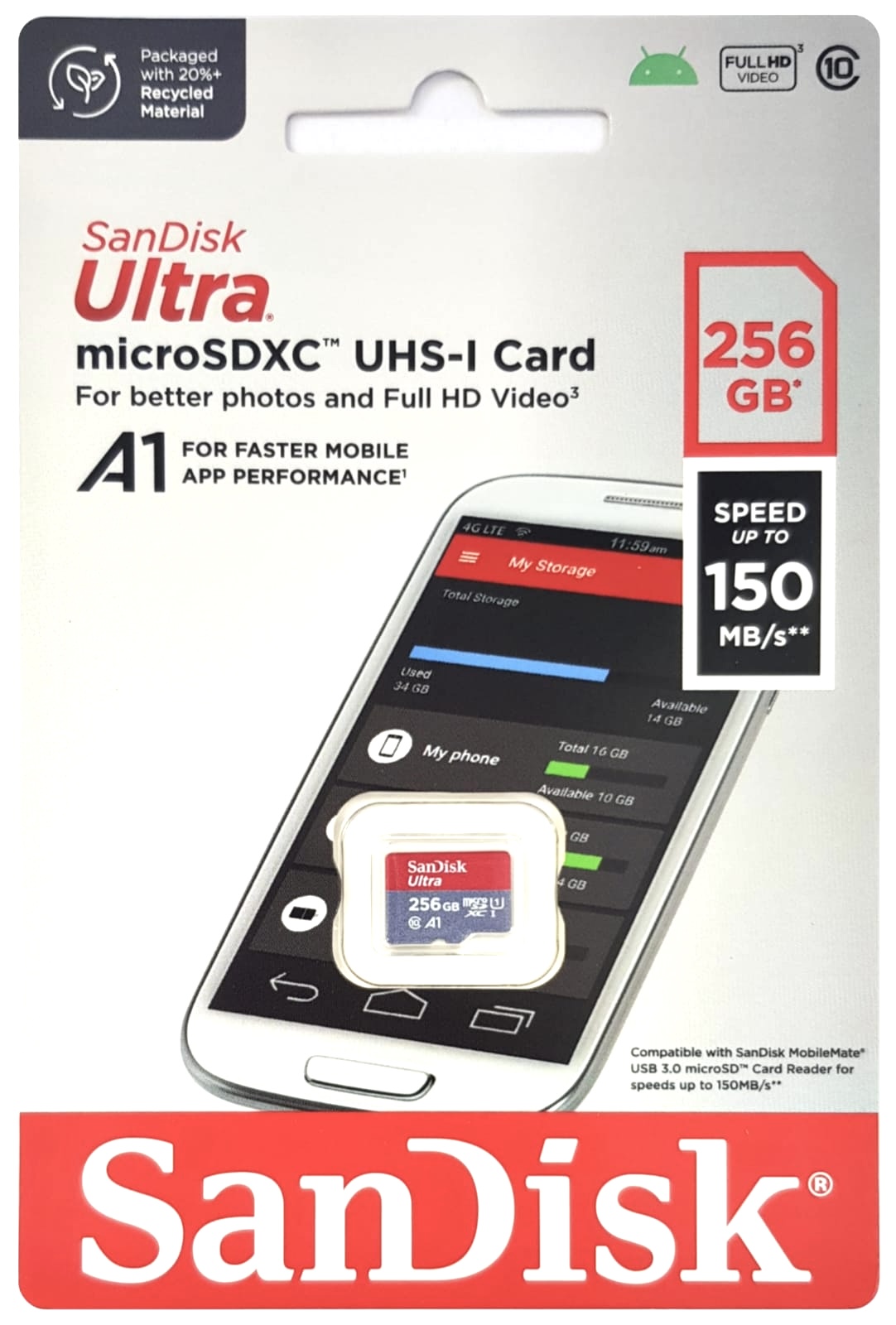 Kartu SanDisk Ultra® microSD™ UHS-I memberi Anda kebebasan untuk memotret, menyimpan, dan membagikan lebih banyak dari sebelumnya. Dengan kapasitas hingga 256 GB, kartu SanDisk Ultra microSD memiliki ruang untuk lebih banyak video Full HD4 dan memberikan kecepatan transfer hingga 150MB/dtk untuk membantu Anda memindahkan konten dengan cepat. Ideal untuk smartphone dan tablet Android™, kartu ini memuat aplikasi lebih cepat dengan kinerja peringkat A1.