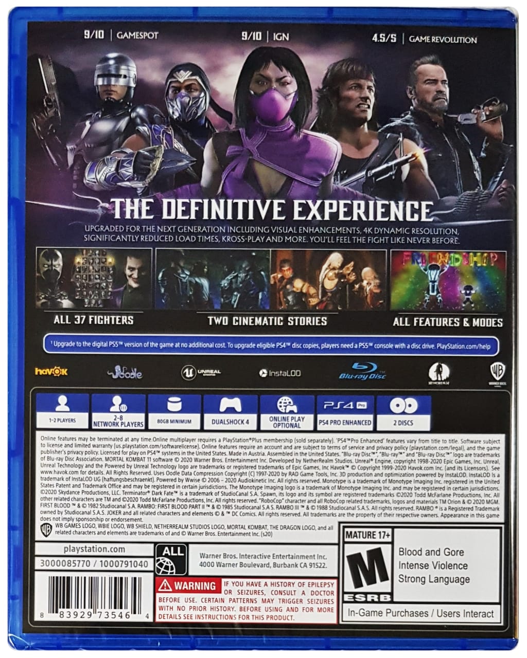 The definitive MK11 experience! Take control of Earthrealm's protectors in the game's TWO critically acclaimed, time-bending Story Campaigns as they race to stop Kronika from rewinding time and rebooting history. Friendships are tested, and new alliances forged, in the battle to save all of existence. MK11 Ultimate features the komplete 37-character roster, including new additions Rain, Mileena & Rambo.