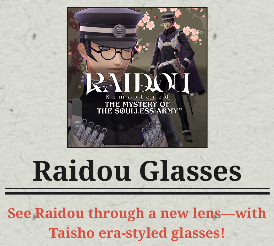 As a special pre-order bonus, receive the cosmetic Raidou Glasses. With these glasses that were popular in the Taisho Era, his charm will increase beyond what one can handle.