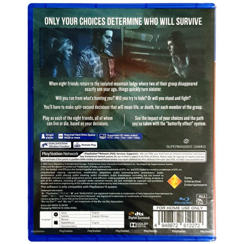 When eight friends become trapped on a remote mountain getaway gone wrong, things quickly turn sinister and they start to suspect they aren't alone. Gripped by fear and with tensions in the group running high, you’ll be forced to make snap decisions that could mean life or death for everyone involved. Every choice you make while playing as each of the eight friends -- even the seemingly trivial ones -- will carve out your own unique story.